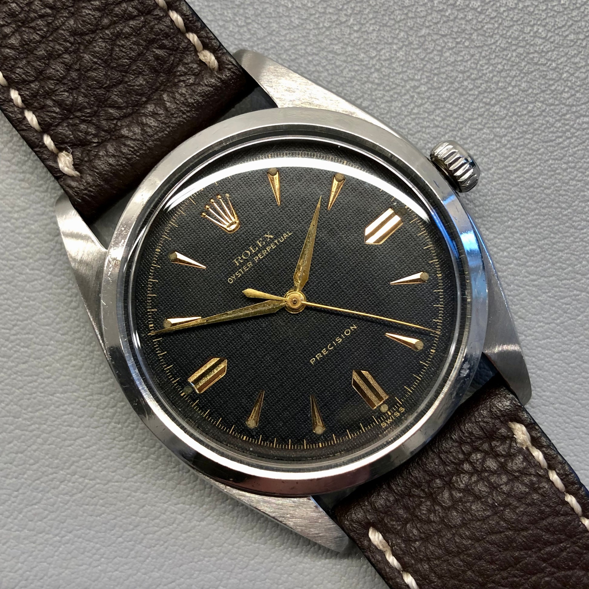 1953 Rolex Oyster Perpetual Precision 6298 Black Honeycomb Dial Automatic Wristwatch. Stainless steel Oyster case is crisp, some light wear in keeping with age and usage. Original Oyster crown is present. Original black honeycomb dial is stunning. Some light patina in keeping with age as shown. Oyster Perpetual automatic movement is running and functioning.