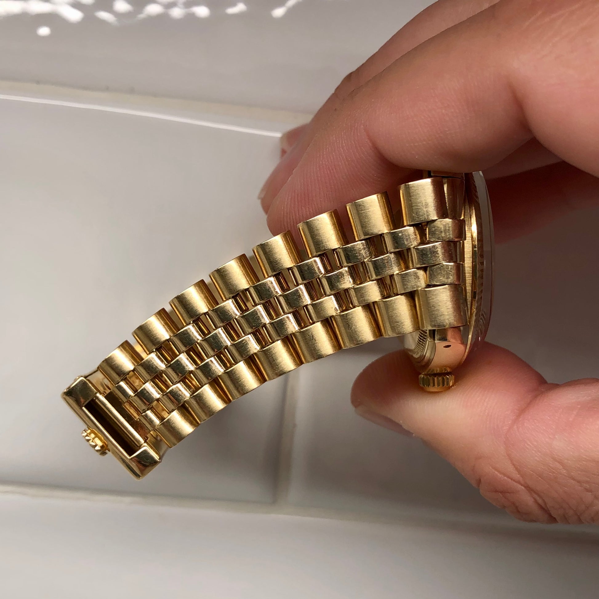 1980 Rolex Date 1503 14K Yellow Gold Silver Mosaic Dial Automatic Wristwatch. In overall great condition. 14k solid yellow gold Oyster case has remained thick and full bodied. Case is fully hallmarked and stamped. Rare 14K yellow gold 6311 jubilee bracelet with 56 marked end pieces is in great condition, some stretch present as shown, will fits an approximate 7.25" wrist size, and is date coded to 1980. Original silver mosaic tritium dial is excellent featuring nice warm lume plots. Hands and dial react to UV and fade rapidly at same pace. Open 6/9 date wheel present. Caliber 1570 Oyster Perpetual movement has been freshly serviced.