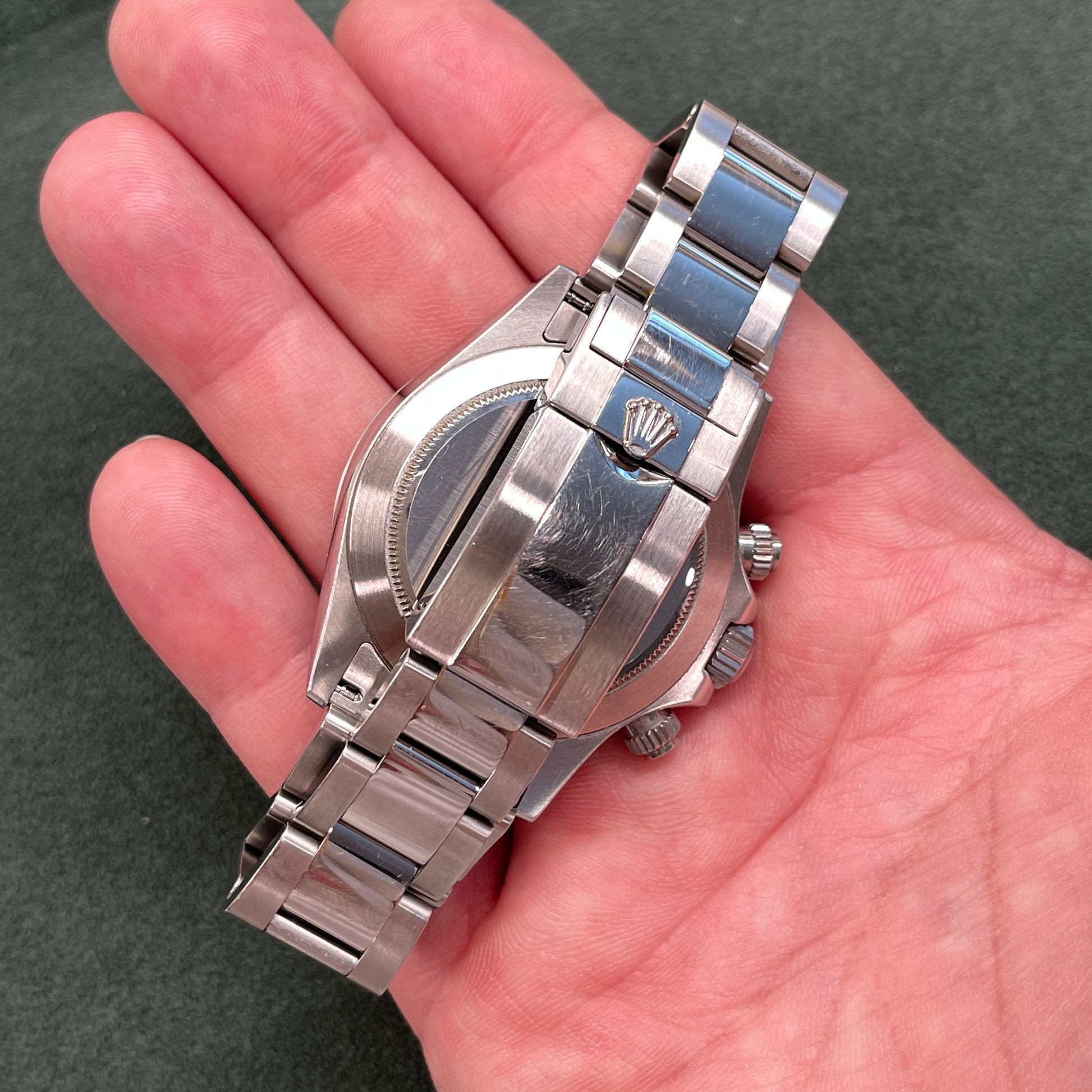 2008 Rolex Daytona Cosmograph 116520 White Steel Oyster Automatic Chronograph. Stainless steel Oyster case and bracelet are in excellent condition. Appears to be unpolished. Bevels and chamfers are crisp. Some general scratching in keeping with usage. Stainless steel Oyster bracelet has 12 links. Sapphire crystal is excellent. Caliber 4030 Oyster Perpetual automatic movement is running and keeping time. Originally purchased from a US authorized Rolex Dealer. Partial sticker left on clasp. Timepiece includes Inner/ Outer Boxes, Booklets, Signed Guarantee Card, Bezel Cover, COSC & Serial Numbered Tags.